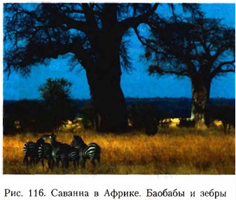 Саванны располагаются к северу и к югу от экваториальных лесов. Это территория с травянистой растительностью и отдельными группами деревьев. Здесь различают зимний тёплый сухой сезон и летний жаркий сезон дождей. Высокие травы, толстая кора редких деревьев, как у африканского баобаба (рис. 116), и мелкие листья, как у акации, помогают запасать воду. Дикие животные (антилопы, зебры) могут пробегать большие расстояния в поисках воды и пищи. Самые известные хищники саванны — львы, гепарды. На огромных пространствах саванн жители занимаются земледелием, пасут скот.
