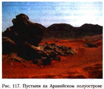 Пустыни занимают значительную территорию на разных широтах на всех материках. На материке Африка располагается одна из величаиших пустынь планеты — Сахара. На западе Южной Америки располагается самая сухая пустыня — Атакама. Огромные территории заняты пустынями в центре Евразии, на Аравийском полуострове (рис. 117).