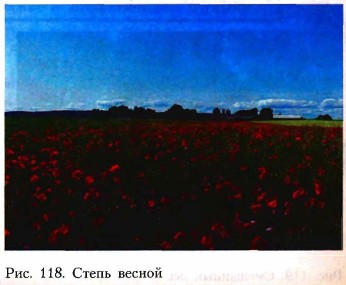 Пустыни образовались в результате недостатка влаги (менее 100 мм в год). Поэтому растительность в них скудная. Животный мир представлен грызунами (тушканчики, песчанки), копытными животными (антилопы, верблюды). В пустынях водятся змеи, ящерицы. Много насекомых — скорпионов, пауков, муравьёв. У растений мощная корневая система, мелкие листья или колючки. В оазисах растёт царица пустыни — финиковая пальма. Население разводит овец, коз, верблюдов, возделывает хлопок, плодовые культуры. Степи — обширные равнинные пространства, покрытые травянистой растительностью (рис. 118). Основная полоса степей находится в Северном полушарии — в Евразии и Северной Америке. В Южном полушарии большие пространства степей в Южной Америке. В степях жаркое, сухое лето и довольно суровая зима, плодородные почвы (чернозёмы) и большое разнообразие злаковой растительности. Здесь водятся грызуны (суслики, мыши), хищники (волки и др.), много птиц. Степи в основном распаханы и густо заселены людьми.