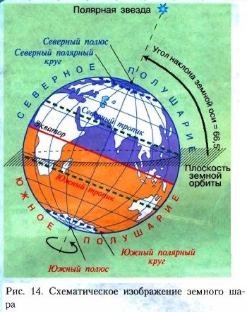 1. Найдите на рисунке земную ось. Она показана пунктиром. 2. Найдите Северный и Южный полюсы. В каких местах Земли они находятся? 3. Найдите, где и как показана плоскость земной орбиты. Как расположена по отношению к ней земная ось? 4. Убедитесь, что земная ось направлена на Полярную звезду северным концом. 5. Найдите, где показано направление осевого вращения Земли. Каково оно? Вы видите на рисунке и другие линии. Они тоже воображаемые и отличаются друг от друга тем, что находятся на разном удалении от полюсов. 6. Красная линия — экватор, он проходит посередине на равном расстоянии от обоих полюсов и разделяет земной шар на Северное и Южное полушария. 7. Зелёные и синие линии — это тропики и полярные круги, проходящие параллельно экватору. Запомните их. Впоследствии они нам очень понадобятся. Полезный совет: Вы можете проверить себя, если воспроизведёте рисунок на отдельном листке, не заглядывая в учебник.