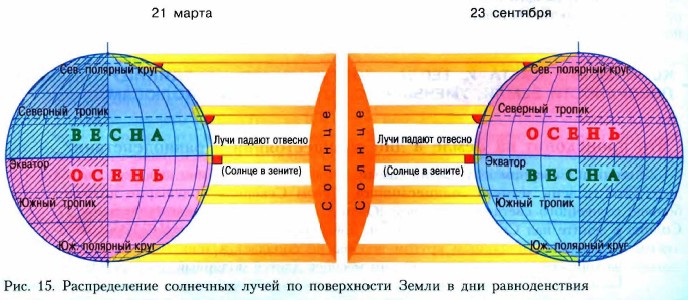 Планета Земля § 7. Солнечный свет на ЗемлеКак распределяются свет и тепло по поверхности Земли. Что происходит на Земле в дни солнцестояния и равноденствия. Как распределяются свет и тепло по поверхности ЗемлиВ один и тот же момент времени разные участки поверхности Земли получают разное количество тепла и света. Северное и Южное полушария Земли в течение года освещаются неодинаково из-за наклона земной оси. В течение года то одно, то другое полушарие освещено Солнцем больше. Посмотрите на рисунок 15. Вы видите, что солнечные лучи как бы упираются в область между тропиками. У полюсов, в полярных областях, лучи словно скользят по поверхности Земли. Угол падения солнечных лучей здесь намного меньше. В районе экватора Солнце стоит высоко над горизонтом, в полярных областях — низко.