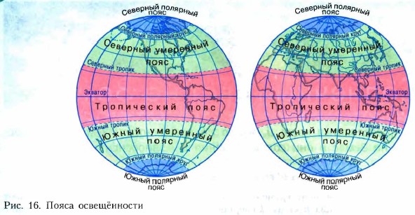 Тропики и полярные круги разделяют поверхность Земли на пояса, различающиеся продолжительностью солнечного освещения и количеством тепла, получаемого от Солнца. В зависимости от угла падения солнечных лучей, продолжительности светового дня выделяют пять поясов освещённости (см. рисунок 16).