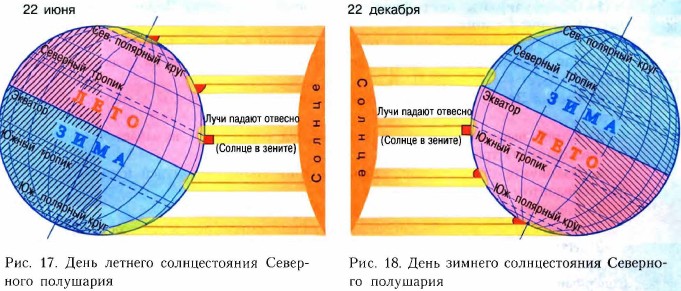 Что происходит на Земле в дни солнцестояния и равноденствия22 июня в Северном полушарии самый длинный день и самая короткая ночь в году. Это — день летнего солнцестояния. Летом Северное полушарие получает больше солнечного света и тепла, чем Южное. Обратите внимание на рисунок 17. Солнце в зените над Северным тропиком, поверхность Земли между Северным полюсом и Северным полярным кругом вообще не попадает в тень. Там Солнце не заходит за горизонт и несколько дней или месяцев длится полярный день. В Южном полушарии всё наоборот. В затенённой части остаётся весь участок между Южным полюсом и Южным полярным кругом и несколько дней или месяцев длится полярная ночь.