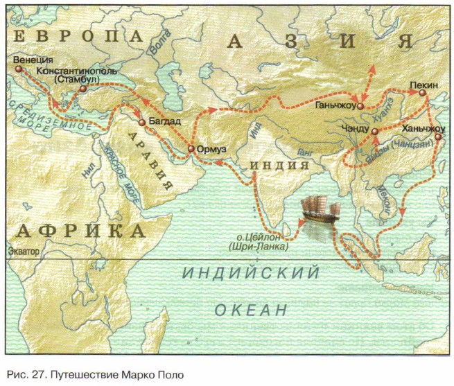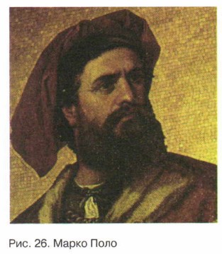 Как вы думаете «Книга Марко Поло» — научный отчёт или приключенческий роман? Об этом великом путешественнике мы бы и не узнали, если бы не две случайности. Но сначала поговорим о его путешествии. Начало путиВ 1271 году из богатого торгового города Венеция отправились в путь купцы. Это были два брата по фамилии Поло: Николо и Матптео. Они уже два раза совершали путешествия по Азии. В этот раз они собирались добраться до Китая — страны, наиболее удалённой от Европы. С ними отправился в путь и Марко — сын Николо. Ему-то и досталась слава великого путешественника (рис. 26). Но давайте обо всём по порядку.