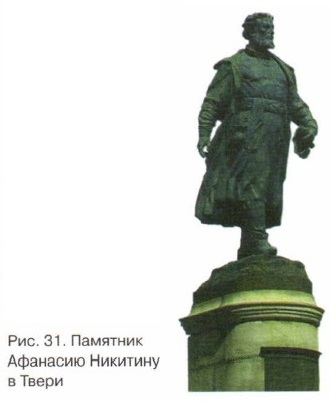 Третье мореВ странствиях по Индии Афанасий Никитин провёл три года. Всё чаще путешественник вспоминал о далёкой родине, да и здоровье его стало ухудшаться. Никитин засобирался домой. Сначала его путь лежал через Аравийское море, потом пешком через Персию, к берегам Чёрного моря, которое Афанасий пересёк на корабле, а дальше снова отправился пешком через дикие степи и дремучие леса. Афанасий Никитин провёл в странствиях шесть лет, преодолел многие тысячи километров, а не дошёл до дома всего 300 км. В Смоленске ему стало плохо. Монахи находившегося неподалеку монастыря пытались выходить его, но Афанасий Никитин не приходил в сознание, бредил на непонятном монахам языке и в конце концов умер. К счастью, его записи сохранились — Афанасий нёс их в своей котомке за плечами. Из этих записей получилась целая книга, которую назвали «Хождение за три моря». Много лет спустя в Твери на берегу Волги, там, где началось путешествие Афанасия Никитина, ему поставили памятник (рис. 31).