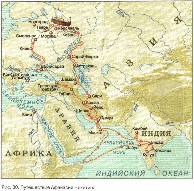 Как вы думаете Афанасий Никитин — первый учёный-географ Руси или предприимчивый купец? Первое мореК северу от Москвы на реке Волга стоит старинный русский город Тверь. Тверские купцы плавали торговать по Волге до самого Каспийского моря. На берегах Каспийского моря находилось богатое, хотя и небольшое государство — Ширванское царство. С ним-то и торговали русские купцы. Жил в Твери молодой купец — Афанасий Никитин. Мы мало что знаем о его жизни, но по одной из версий известно, что в 1466 году Афанасий вместе с группой тверских купцов отправился на челнах вниз по Волге. По реке они должны были добраться до города Астрахани, там пересесть с речных кораблей на морские и по Каспийскому морю прийти в Ширванское царство. Но недалеко от Астрахани на купеческие корабли напали разбойники. Они дочиста ограбили купцов. Без товара не было смысла ехать дальше, и купцы решили вернуться в Тверь. Но Афанасий Никитин отправился дальше, чтобы посмотреть на Ширванское царство: как там люди живут, чем торгуют. На последние, чудом сбережённые гроши он купил себе место на корабле и прибыл в Ширванское царство. Куда пойдёт торговый человек в незнакомом городе? Конечно, на базар! Там Афанасий увидел удивительные товары: яркие тонкие ткани, богато украшенное оружие, пряности — это приправы, которые делают блюда более вкусными и ароматными. Привозили пряности из жарких стран, где они растут, так же как у нас растёт трава и деревья. Афанасий Никитин узнал, что всё это привезено из Индии. Он уже слышал про сказочно богатую Индию. Афанасий стал расспрашивать о том, как туда добраться. Оказалось, что нужно переправиться через Каспийское море, потом по караванному пути пересечь большую страну Персию и дойти до другого моря — Аравийского. Ну а за этим морем уже и Индия (рис. 30). От знающих людей он узнал, что в Индии не умеют выращивать лошадей, и поэтому лошади там стоят дорого. Афанасий много работал, купил хорошего коня, чтобы с выгодой продать его в Индии. Переправился Афанасий Никитин через Каспийское море и вместе с караваном арабских купцов пошёл через Персию к Аравийскому морю.