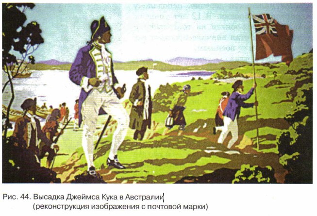 История географических открытий § 15. Открытие Южного материкаВокруг света всегда плавали с какой-то целью. Кругосветное плавание Кука имело не одну такую цель. Первая цель была астрономическая. Необходимо было провести наблюдение за очень редким астрономическим явлением, которое можно было наблюдать только в южной части Тихого океана. Вторая цель — поиски Неизвестной Южной Земли. Не забывайте, что о голландских открытиях никто ничего не знал. Джеймс Кук великолепно справился с этими задачами. Он прошёл вдоль восточного берега неизвестного материка, убедился, что это не отдельные группы островов, а именно материк. Кук высадился на нём и объявил его собственностью Великобритании (рис. 44).