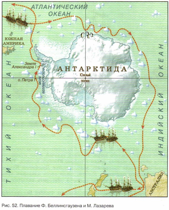 История географических открытий § 18. Вокруг света под русским флагомКак и Джеймс Кук, русские моряки двигались вдоль кромки льдов, пытаясь проникнуть как можно дальше на юг (рис. 52). Но нашим морякам повезло больше — однажды в январе 1820 года на горизонте появились покрытые снегом и льдом берега неизвестной земли. Пристать к берегу и ступить на открытую землю не получилось, так как океан покрыт льдом, сквозь который пробиться невозможно, но в судовом журнале экспедиции появляется запись об открытии материка — Антарктиды.