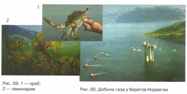 Широко используются морские организмы и как сырьё для промышленности: из мелкой рыбы получают клей и костную муку; кожу крупных рыб применяют в кожевенной промышленности; из водорослей делают лекарства, красители, крахмал, изготавливают бумагу. Испокон веков человек получал из воды морей и океанов поваренную соль, а позже и другие соли. Дно Мирового океана богато полезными ископаемыми. Здесь есть нефть, газ (рис. 60), каменный уголь, железная руда и даже алмазы и золото. В прибрежных водах Юго-Западной Африки ведётся добыча алмазов. В водах, омывающих Аляску, добывают золото. Но как ни был бы велик океан, человек должен относиться к нему бережно, охранять и рационально использовать его богатства. Воды многих морей и океанов загрязнены, гибнут ценные виды рыб, редкие виды птиц и млекопитающих.