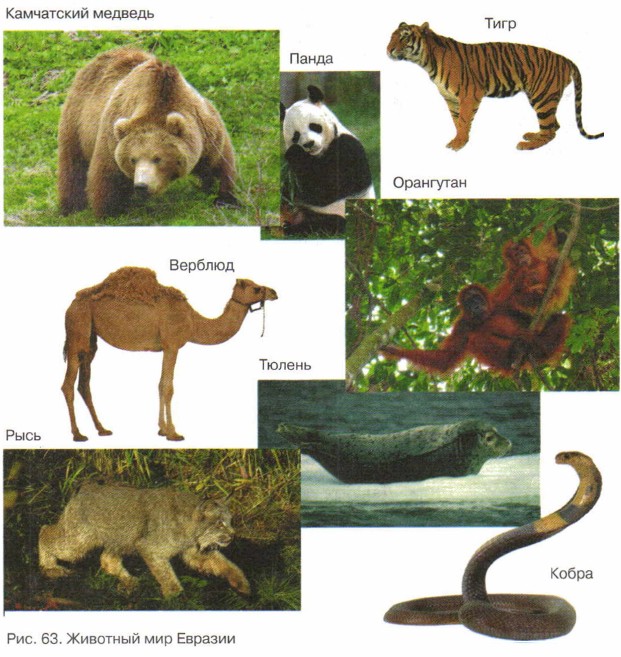 Путешествие по планете Земля § 21. Путешествие по ЕвразииНа территории Евразии встречаются все природные зоны нашей планеты: от ледяных (арктических) пустынь на севере до влажных экваториальных лесов на юге. Растительный и животный мир этого материка очень богат (рис. 63).