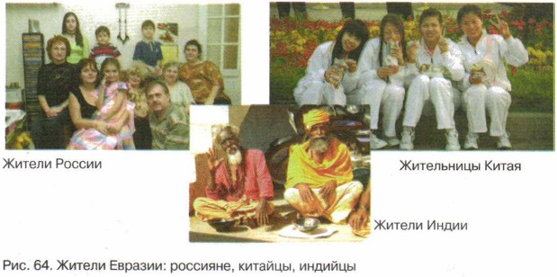 Население ЕвразииЕвразию населяют многочисленные народы (рис. 64). Многие из них имеют древнюю культуру и историю. Численность населения Евразии составляет около 4,8 млрд человек — это более 60% населения земного шара.