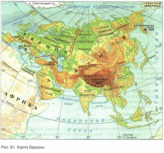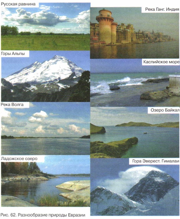 Большинство рек Европы в среднем и нижнем течениях широкие и полноводные. Самые крупные из них — Волга, Дунай, Рейн. Озёрами особенно богат север Европы. Здесь находится несколько тысяч озёр. Большинство из них невелики, но есть и крупные, например Ладожское и Онежское. Самыми крупными равнинами Азии являются Западно-Сибирская равнина и Среднесибирское плоскогорье. Реки Азии очень разнообразны. Это и быстрые горные речки, и величавые реки низменностей, несущие свои воды к океанам. Реки пустынь теряются в песках, их русла наполняются водой только в период дождей. В Азии много крупных рек. Это Инд и Ганг, впадающие в Индийский океан; Амур, Янцзы и Хуанхэ — в Тихий океан; Обь, Енисей и Лена — в Северный Ледовитый океан. В Азии находится самое большое озеро нашей планеты — Каспийское море, его площадь составляет около 396 тыс. км2. Здесь же, в Азии, находится жемчужина нашей страны — озеро Байкал — самое глубокое озеро в мире. Его глубина составляет 1638 м. В Азии находятся высочайшие горы Земли — Гималаи, с высочайшей вершиной — горой Эверест (8848 м). Гигантские размеры континента, окружающие его моря и океаны, разнообразный рельеф материка привели к тому, что в различных его частях сформировались разнообразные природные условия. В российском посёлке Оймякон находится полюс холода Евразии и всего Северного полушария. Это значит, что нигде в Евразии не бывает холоднее, чем здесь. Ещё бы! Ведь зимой температура здесь опускается до -71 °С. В Евразии находится одно из самых влажных мест на Земле. В Индии в городе Черапунджи выпадает около 12 тыс. мм осадков в год.