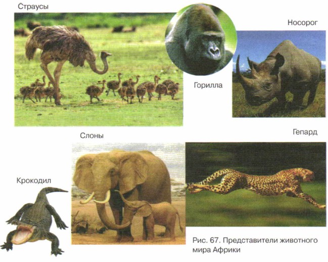 Путешествие по планете Земля § 22. Путешествие по АфрикеЖивотный и растительный мир Африки богат и многообразен (рис. 67).