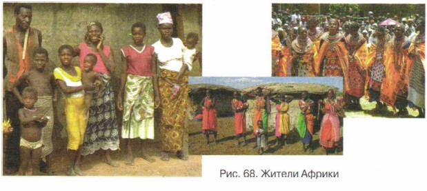 Население АфрикиАфрику населяют многочисленные народы с тёмным цветом кожи и курчавыми волосами (рис. 68), только на севере и северо- востоке Африки проживают более светлокожие арабы и берберы. Чёрный цвет кожи и курчавые волосы предохраняют местных жителей от солнечных лучей и перегревания.