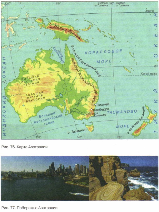 Как вы думаете Почему на территории материка расположено всего одно государство? Географическое положение АвстралииАвстралия самый маленький (около 7 млн км2) и самый засушливый материк нашей планеты (рис. 76). Он полностью расположен в Южном полушарии. Его окружают тёплые воды Индийского и Тихого океанов (рис. 77).