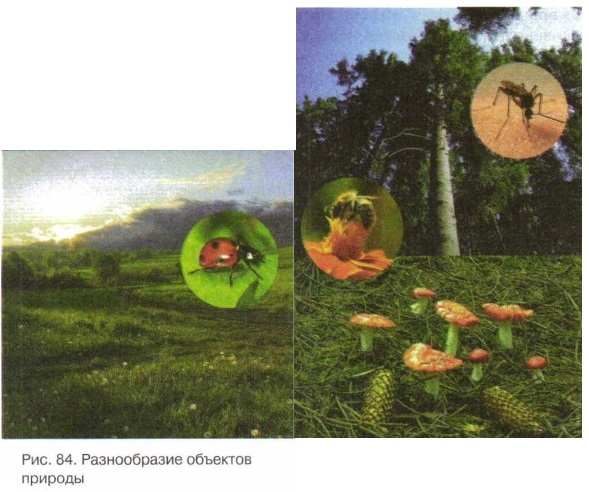 Как вы думаете Есть ли у природы границы? Встреча с природойИтак, мы познакомились с материками Земли. Говоря о них, мы часто произносили слово «природа». А что такое природа? Самый первый ответ, наверное, будет такой: «Природа — это всё, что нас окружает». Однако если подумать, то под это определение попадает много лишнего. То есть не всё, что нас окружает, — это природа. Давайте попробуем разобраться, из чего состоит природа. Для этого представим себе, что мы совершили прогулку по окрестностям своего населённого пункта. Итак, начнём. Мы шли по тропинке, идущей через цветущий луг. Вокруг ярких цветов порхали бабочки, а вокруг нас вились надоедливые мошки. И бабочки, и мошки хотели одного — поесть, но почему-то нам бабочки нравились больше, чем мошки. Дорога шла то вверх, то вниз. Идти с горки было легче и веселее, но всегда нужно помнить, что для того, чтобы откуда-то спускаться, сначала нужно куда-то взобраться. Солнце грело всё сильнее, и мошки становились всё назойливее. Хорошо, что иногда по небу пробегали облака, подгоняемые приятным освежающим ветерком. И вдруг стало совсем хорошо — мы вошли в лес. В тени деревьев было прохладно, да и почти все мошки остались позади {рис. 84). По деревянному мостику мы перешли через лесную речушку, на другом берегу которой стали попадаться грибы. Кто-то, увлёкшись поиском грибов, не заметил опасности, оступился и кубарем скатился в овраг. Овраг, к счастью, оказался неглубоким, но зато дно его густо заросло старой и злой крапивой. В общем, пока помогали вылезти из оврага упавшему, досталось всем. Яростно почёсываясь, мы расположились на полянке и, смеясь, принялись вспоминать о только что пережитом приключении. И тут на полянку вышел медведь... На этом наша прогулка закончилась.