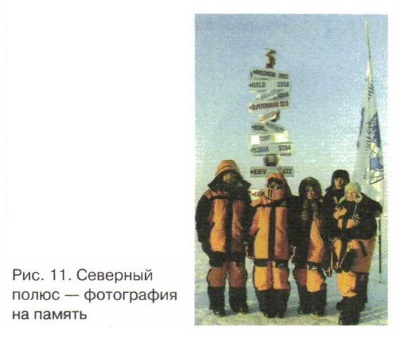 Земля и её изображение § 4. Форма, размеры и движения ЗемлиПолюсы и экваторЗемля вращается. Стало быть, все точки на её поверхности совершают это движение? Нет, не все. Проткните карандашом лист бумаги и покрутите его. Видите? Лист вращается. А ось вращения, то есть карандаш, который вы держите в руке? Если крепко держите, то не вращается. А значит, точка пересечения карандаша с листом бумаги неподвижна. Зато всё вертится вокруг оси, которая проходит через эту точку. То же самое и с земным шаром. Шар вращается, а вот точки пересечения его поверхности с осью вращения неподвижны. Эти точки называются полюса́ми. На поверхности Земли есть всего две точки, которые не участвуют в осевом вращении — это полюсы, Северный и Южный. На этих точках побывал человек. Можете побывать и вы, если захотите (рис. 11).