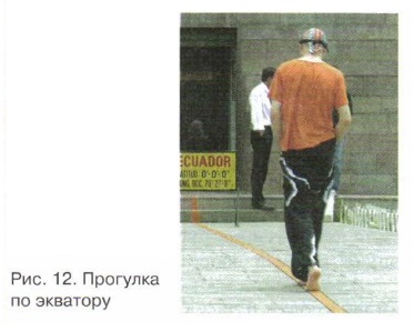А теперь нарисуйте на листе бумаги две точки и подумайте, сколько вы сможете провести на этом листе прямых линий, которые в любой своей точке находились бы на одинаковом расстоянии от этих двух точек? А сколько по поверхности земного шара может быть проведено линий, чтобы они везде находились на одинаковом расстоянии от обоих полюсов? Очевидно, что в обоих случаях можно провести только одну такую линию. Давайте посмотрим на глобус. Видите в его средней части толстую линию? Она находится на одинаковом удалении от обоих полюсов, то есть делит планету пополам. Эта линия называется эква́тором (рис. 12). Экватор делит земной шар на два полушария — Северное и Южное.