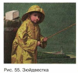 Географическая карта Стороны горизонта. ГеографияЗюйдвесткаЛучшими картографами прошлого были голландцы. С той поры существует традиция называть румбы по-голландски: север — норд (nord), юг — зюйд (zuiden), восток — ост (ost), запад — вест (west). Именно поэтому на некоторых компасах северное направление помечено буквой N, а южное — S. Но голландцы были и прекрасными моряками. Именно они изобрели особой формы головной убор для моряков. Это брезентовая шляпа, надёжно закрывающая шею и плечи моряка от ветра и дождя (рис. 55).