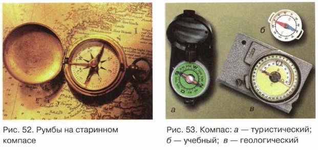 РумбыСтороны горизонта по-другому называют странами света. А ещё их называют румбами (рис. 52). Кроме четырёх основных румбов, выделяют ещё четыре промежуточных: северо-восток (СВ), северо-запад (СЗ), юго-восток (ЮВ) и юго-запад (ЮЗ). Есть ещё восемь промежуточных румбов. Например, направление между северным и северо-восточным называют северо-северо-восточным (ССВ), а между северо-восточным и восточным — востоко-северо-восточным (ВСВ) и т.д.