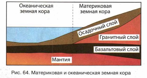 Литосфера § 12. Строение земного шараВнешний слой земного шараИ вот мы добираемся до самого главного слоя в строении Земли. Ведь на его поверхности мы все живём. Называется он — земная кора. «Минуточку», — скажет тот, кто умеет и любит складывать цифры в столбик. Ядро — 3,5 тыс. км. Мантия — 2,9 тыс. км. Итого — 6,4 тыс. км. А у нас весь земной шар имеет экваториальный радиус 6378 км. Что-то не сходится. На самом деле всё сходится. Во-первых, о толщине того или иного слоя мы всегда говорили «приблизительно» или «около», так что и результат сложения получается весьма приблизительный. А во-вторых, третий слой, он такой тонкий, что его можно было бы и не заметить, если бы он не лежал прямо у нас под ногами. «Кора» — не самое точное слово для описания этого слоя. В самом деле, представьте, радиус Земли 6,3 тыс. км, а максимальная толщина земной коры составляет около 80 км. Почти в сто раз меньше! Это не кора. Это даже не корка. Это кожица. Но термин «земная кора» введён уже много лет назад, поэтому стал привычным. Давайте не будем его отменять. Земная кора так земная кора. Толщина земной коры различна. Самая толстая земная кора лежит под материками, её так и называют — материковая (рис. 64 ). Она имеет толщину от 30 до 80 км. А самая тонкая — ну... догадайтесь, где она должна быть? Конечно, под океанами. Больше негде. Толщина у неё всего-то 5-10 км. И называется она... Нет, не океанская. Правильнее говорить — океаническая.