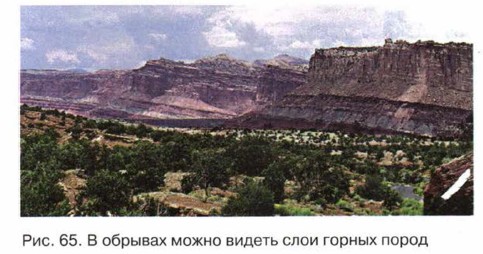 Изучение недр ЗемлиА как же узнали всё это о строении Земли? Ну, с земной корой как раз всё понятно. Ведь в ней находятся месторождения полезных ископаемых, которые просто необходимы человеку. Поэтому уже давно земная кора самым внимательным образом изучается специальной наукой — геологией. Геологи изучают горные породы, которые видны в обрывах, на крутых берегах, на склонах гор (рис. 65). Изучению земной коры помогает создание шахт, в которых добывают разные полезные ископаемые. Если это необходимо, бурят глубокие скважины в земной коре. Из этих скважин с большой глубины извлекают образцы горных пород и по ним судят о строении земной коры. Кстати, самая глубокая в мире скважина находится в нашей стране. Расположена она на Кольском полуострове. А глубина её более 12 км.