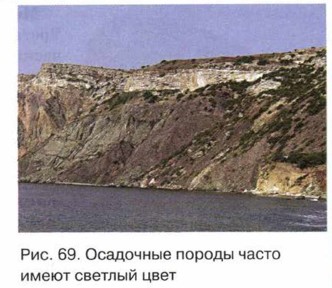 Литосфера § 13. Виды горных породОсадочные горные породыДругим видом горных пород являются осадочные породы. Их возникновение связано с осаждением частиц на дне океана, моря, вообще любого водоёма. Осадки могут накапливаться и на суше (рис. 69). Существует три вида осадочных горных пород.