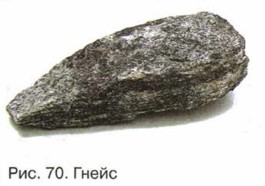 Метаморфические горные породыТретий вид горных пород — метаморфические. Название пород происходит от греческого слова «метаморфос» — превращение. Горные породы возникли очень давно — миллионы и сотни миллионов лет тому назад. За это время они могли испытать различные изменения. Например, образовавшиеся на поверхности Земли магматические и осадочные горные породы опустились на большую глубину в нижние слои земной коры. Там на них действовали высокие температуры и давление. Под их воздействием они и превращаются в метаморфические. Песок становится кварцитом, известняк — мрамором, а гранит — гнейсом (рис. 70).
