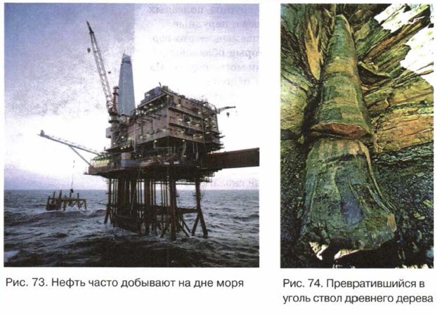 Поиск полезных ископаемыхПолезные ископаемые — это горные породы и минералы, а они по происхождению бывают магматическими, осадочными и метаморфическими. Магматические и метаморфические породы особенно распространены в горах, в то время как осадочные залегают на равнинах. Для поиска полезных ископаемых нужно установить, какие из них являются осадочными, а какие магматическими и метаморфическими. После этого станет ясно, где их искать. Топливные полезные ископаемые по своему происхождению являются осадочными, наиболее значительные их запасы сосредоточены на равнинах. Причём нефть и газ образуются в морских условиях. Поэтому крупные месторождения этих ископаемых обнаружены на приморских равнинах и даже на дне морей (рис. 73). Что касается каменного угля, то он возникает там, где раньше были дремучие леса. Чаще всего месторождения угля обнаруживаются на равнинах или в невысоких горах в средней части материков (рис. 74 ).