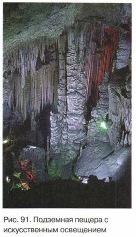 Литосфера Выветривание горных породХимическое выветриваниеЭтот вид выветривания связан с тем, что вода способна растворять многие вещества и горные породы. К таким породам относится известняк, гипс и многие соли. Представьте себе последствия проникновения воды в подземные слои отложений каменной соли. Что произойдёт? То же самое, что случится с солью, попавшей из солонки в кастрюлю с варящимися пельменями. Соль просто растворится. Она, конечно, никуда не исчезнет, она перейдёт в раствор, но как это будет выглядеть внешне? Соль исчезнет. В слоях таких пород появляются пустоты, промоины, пещеры (рис. 91).