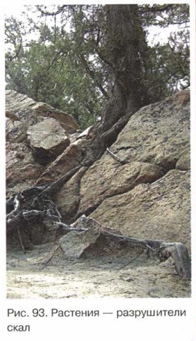 Асфальт, конечно, имеет искусственное происхождение. Но неужели, если на пути этих растений оказались бы слои природных горных пород, они не стали бы прорастать? Побоялись бы? Нет, горные породы были бы точно так же разрушены, как и асфальт. Другой пример. Семечко попадает в трещину скалы. Из этого семечка вырастет деревце, корни которого разрушают скалу (рис. 93). Это тоже проявление биогенного выветривания.