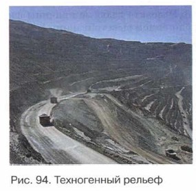 Литосфера Выветривание горных пород. ГеографияЕщё одна силаИ наконец, есть ещё одна причина разрушения горных пород. Как это — ещё одна, может кто-то возмутиться. Было же сказано, что их три! Друзья мои, читайте внимательно. В начале параграфа написано: «В природе существует три вида выветривания». Видите? В природе. А мы сейчас поговорим не о природном процессе, а о техногенном. Можете самостоятельно перевести это слово — «техногенный»? Очевидно, что речь идёт о процессе, связанном с применением техники. Так как только человек применяет технику, техногенные процессы по-другому называют антропогенными (от греческого слова «антропос» — «человек»). Техногенные, или антропогенные, процессы — это процессы, связанные с хозяйственной деятельностью человека. При строительстве или добыче полезных ископаемых человек разрушает горные породы. Он пробивает туннели в горах, для того чтобы пустить по ним дороги, создаёт огромные карьеры для добычи полезных ископаемых (рис. 94 ).