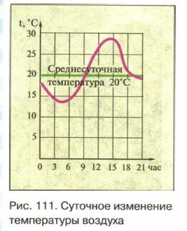 Атмосфера § 19. Температура воздухаИзменение температуры во времениА что будет с температурой, если мы находимся на одном месте? Неужели температура останется неизменной? Конечно, нет. И все это прекрасно знают. Температура днём и ночью разная, зимой и летом — тоже разная. Она вообще постоянно меняется. Меняется во времени, как говорят учёные. Почему это происходит? Солнце встаёт на востоке, поднимается всё выше и выше, а затем начинает опускаться. Пока не зайдёт за горизонт. Суточное вращение Земли приводит к тому, что угол падения солнечных лучей на поверхность Земли меняется. А значит, меняется и нагрев этой поверхности. В свою очередь, и воздух, который нагревается от поверхности Земли, получает в течение дня разное количество тепла (рис. 111). А ночью от Солнца не получает его вовсе. Вот в чём причина суточной изменчивости температуры. Тоже мне открытие, скажет кто-то. Это и так всем известно. Конечно, известно. Но теперь вы знаете, ПОЧЕМУ всё происходит именно так.