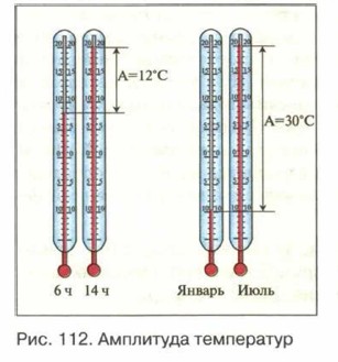 Почему зимой холоднее, чем летом? Небольшая подсказка. Это обусловлено двумя причинами. Первую мы уже точно знаем — зимой солнце не так высоко поднимается над горизонтом. Поэтому зимой даже в полдень на земную поверхность приходит меньше света и тепла, чем летним вечером. А вторая-то какая причина? Вы, наверное, просто успели забыть про летние каникулы? Вспомните, как долго продолжался день летом. И какой он короткий сейчас, зимой. Зимой солнце просто меньше времени находится над горизонтом, чем летом. Вот и всё. Остальное и так понятно. Амплитуда температурРазность самой высокой и самой низкой температуры воздуха в течение суток называется суточной амплитудой температур (рис. 112).