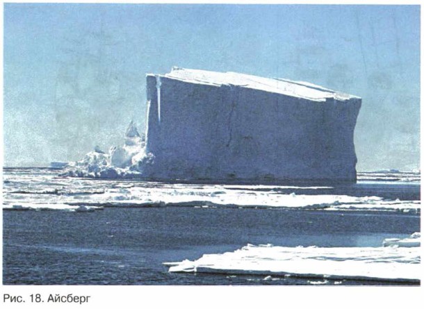 В распоряжении экспедиции было два небольших, но надёжных и крепких судна: «Восток» и «Мирный» (рис. 17). Корабли сначала следовали по пути Магеллана, но потом повернули к берегам Австралии. Отсюда, после небольшого отдыха, экспедиция направилась прямо на юг. Через некоторое время на пути кораблей всё чаще стали появляться гигантские плавучие ледяные горы — айсберги (рис. 18). Плавание становилось всё более опасным. Всё труднее было найти проход между айсбергами и огромными ледяными полями. Тем не менее продвижение на юг продолжилось. Наконец на горизонте появились покрытые снегом и льдом берега неизвестной земли. Пристать к берегу и ступить на открытую землю не получилось, так как океан был покрыт льдом, сквозь который невозможно пробиться, но в судовом журнале экспедиции появилась запись об открытии материка.