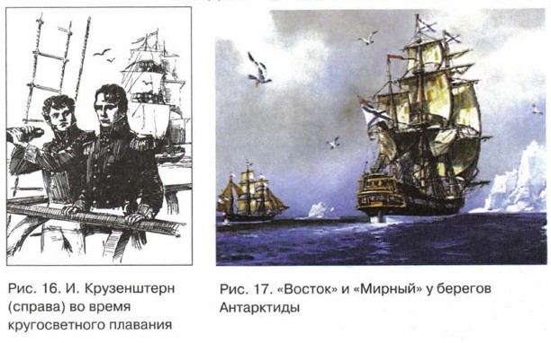 Введение Из истории географических открытий. ГеографияРусские моряки — открыватели самого южного материкаРоссия начала организовывать свои первые кругосветные экспедиции позже многих европейских стран. Только в самом начале XIX века, в 1803 году, началась первая русская кругосветка. Ею командовал великолепный моряк и замечательный человек Иван Крузенштерн (рис. 16). По возвращении Крузенштерн занимался организацией новых кругосветных плаваний русских моряков. В 1819 году он организовал вторую русскую кругосветку. На двух кораблях отправились в плавание Фаддей Беллинсгаузен и Михаил Лазарев. Для них это было уже второе кругосветное плавание, ведь совсем молодыми людьми они плавали вместе с Крузенштерном. Перед экспедицией стояла невероятно сложная задача — пройти как можно дальше на юг и попытаться решить загадку южного материка. Этот материк безуспешно пытались найти уже несколько поколений моряков.