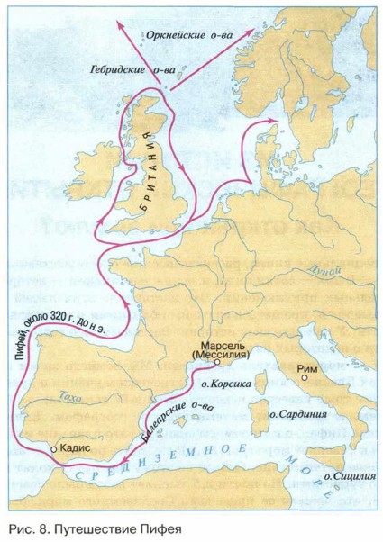 Введение Из истории географических открытийПифей — мореплаватель древностиМы немного знаем о путешественниках Древнего мира (рис. 7). О греческом учёном и путешественнике Пифее тоже известно немного. Жил в IV веке до н. э., был мореплавателем, астрономом, математиком и географом. Единственное путешествие Пифея, о котором мы знаем, — это плавание из Средиземного моря в Северное море (рис. 8). Посмотрите по карте — это не такое уж и далёкое путешествие. Сейчас по этому маршруту ходят круизные лайнеры с туристами. Но почти 2,5 тыс. лет назад было совсем по-другому. Всё, что лежало за пределами Средиземного моря, было совершенно неизвестным миром. В те времена моряки ещё боялись моря, опасались потерять из виду берег. Очень часто даже ночевать старались не в море, а на берегу.