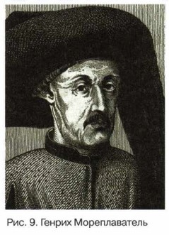 В эту неизвестность и отправился Пифей. Его плавание продолжалось несколько лет. По мнению некоторых учёных, Пифей на своих кораблях входил и в Балтийское море. А повернул он назад, потому что однажды с ужасом обнаружил, что море покрылось слоем «твёрдых медуз». Что за «твёрдые медузы»? Пифей, житель южной страны, ни разу в жизни не видел снега и льда. В его языке даже слов таких не было! Видимо, наступила зима и море стало замерзать. Покрывший море лёд Пифей и назвал «твёрдыми медузами». Пифей решил повернуть обратно в родные края. То, что Пифей не отважился двигаться дальше, вовсе не говорит о трусости этого человека. Поставьте себя на его место. Как поступили бы вы, если бы впервые увидели, как море, по которому вы всю жизнь плавали, становится твёрдым? Обратите внимание, как мало люди знали об окружающем их мире, сколько непонятного, казавшегося им опасным, приходилось встречать во время своих странствий путешественникам древности. Генрих Мореплаватель — великий организаторУдивительно, но человек, вошедший в историю под прозвищем Мореплаватель, не совершил ни одного плавания. Богатейшей страной средневекового мира считалась Индия. Торговать с ней мечтали многие европейские страны. Но сухопутный маршрут из Европы в Индию был страшно длинным и смертельно опасным. Португальский принц Генрих (рис. 9), которого тогда ещё никто не называл Мореплавателем, решил найти морской путь в Индию. Генрих понимал, что этот путь должен огибать Африку. Но берега Африки никому не известны, люди не знают даже, насколько далеко на юг она тянется. К тому же у человека ещё не было опыта длительных морских экспедиций.