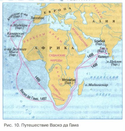 Генрих взялся за дело очень серьёзно. Он организовал мореходную школу и пригласил работать в ней самых известных учёных со всего Средиземноморья. В этой школе обучались капитаны, которые потом будут направляться Генрихом на поиски пути вокруг Африки. Очень медленно, на протяжении многих лет капитаны Генриха Мореплавателя изучали берега Африки, наносили их на карту. Пользуясь этими картами, португальцы освоили африканское побережье, построили там порты. На протяжении почти 40 лет корабли Генриха Мореплавателя продвигались на юг. И вдруг — Африка кончилась. Берег, который всегда был слева по борту, исчез. Найден проход в Индийский океан. Путь в Индию открыт! Первым по морскому пути в Индию добрался капитан Васко да Гама (рис. 10). Почему-то именно его называют открывателем морского пути в Индию. А вы как думаете: кто открыл морской путь в Индию? Васко да Гама — один из многих капитанов, посылавшихся к берегам Африки? Или принц Генрих, посвятивший этому всю свою жизнь? Мореплаватель, не совершивший ни одного плавания... Подумайте... Кстати, а почему он сам не путешествовал? Почему посылал других? Нельзя было. Закон запрещал подвергать риску жизнь принца.