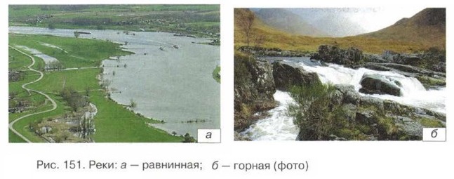 Особенно хорошо водоразделы выражены в горах, где их границами служат вершины горных хребтов. Они буквально «разделяют воду», ведь с каждого склона хребта вода стекает в разные стороны и попадает в разные реки, находящиеся между горными хребтами. На равнине же определить местоположение водораздела иногда бывает непросто. В зависимости от уклона поверхности и скорости течения различают горные и равнинные реки. Равнинные реки отличаются медленным плавным течением и, как правило, большой шириной. Горные же реки, как правило, узкие, неглубокие, но зато такие быстрые, что переплыть их или перейти вброд почти невозможно (рис. 151).