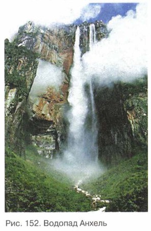 Если на пути реки оказывается крутой уступ, вода свободным потоком обрушивается с этого уступа вниз, образуя водопад. Самый высокий водопад мира находится на небольшой речке в Южной Америке. Речка-то небольшая, но уступ, оказавшийся на её пути, имеет высоту более километра. Вот с этой-то высоты и срывается вниз эта река. Имя этого водопада — Анхель (рис. 152).
