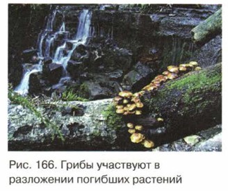 И наконец, четвёртое царство — царство грибов. Это особая группа живых организмов, отличающихся и от растений, и от животных. Они занимают промежуточное положение между этими царствами живых организмов. Как и растения, грибы ведут неподвижный образ жизни. Как и животные, грибы не способны производить органическое вещество из неорганического. Подобно бактериям, они питаются готовым органическим веществом, которое получают, разлагая остатки животных и растений. В лесу, например, грибы участвуют в разложении опавших листьев (рис. 166). Получившиеся в результате вещества потом усваиваются растениями, помогая их росту и развитию. Поэтому грибы занимают особое место в круговороте веществ.