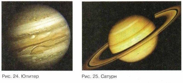 Следующие четыре планеты очень похожи друг на друга. Их называют газовыми гигантами. Они действительно очень велики — в десятки, а то и в сотни раз больше Земли. И они действительно состоят из газа. Целиком. То есть это огромные газовые пузыри, вращающиеся вокруг Солнца. Юпитер — самая большая планета Солнечной системы (рис. 24). Сатурн украшен гигантским кольцом, состоящим из бесчисленного количества твёрдых обломков, вращающихся вокруг него. На самом деле кольца есть у всех газовых гигантов, но у Сатурна оно просто самое яркое и заметное (рис. 25). Кроме того, вокруг планет-гигантов вращается множество спутников. Например, у Сатурна таких «лун» почти 40! Сатурн — это последняя планета, которую можно увидеть на ночном небе невооруженным глазом. Уран и Нептун, которые находятся гораздо дальше от Солнца, увидеть можно только в хороший телескоп.