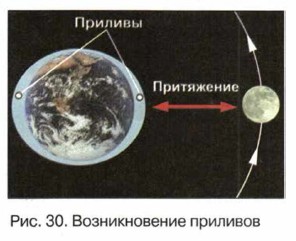 Тем не менее мы летом любим загорать, как зонтик прикрывает от Делать это нужно осторожно. Лучше утром яркого солнца или вечером. Днём же, когда солнце особенно жаркое, лучше загорать, как это ни странно, в тени. Кстати, весной нужно вести себя совсем иначе. После долгой зимы в нашем организме не хватает очень важного витамина D. Именно солнечный свет позволяет его восполнить. Так что весной следует пользоваться каждым погожим днём, для того чтобы погреться на солнце. Воздействие Луны проявляется совсем по-другому. Во Вселенной между космическими телами существуют силы взаимного притяжения. Луна находится очень близко от Земли, и поэтому её притяжение особенно заметно в явлении морских приливов (рис. 29).