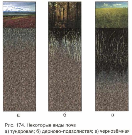 Условия развития разных типов почвТепло и влага — необходимые условия для формирования почвы и её плодородия. Действительно, это очень важные факторы существования почвы. Но ведь тепло и влага связаны с климатом. Таким образом, оказывается, что почва, её формирование и плодородие, зависит от климата, который вполне закономерно изменяется от экватора к полюсам. Очевидно, что вслед за ним так же закономерно будут изменяться почвы (рис. 174 ).