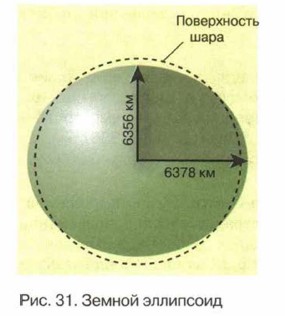 Размеры ЗемлиЕсли сравнивать Землю с другими планетами Солнечной системы, то окажется, что по своим размерам наша планета ничего особенного не представляет. Иначе говоря, Земля занимает 5 место из 8 планет. Мы живём на средней планете Солнечной системы. А сколько же это в километрах? Каков радиус Земли? Поскольку наша планета немного сплюснута с полюсов, принято указывать два её радиуса: полярный, то есть расстояние от центра планеты до её полюса, и экваториальный — расстояние от центра планеты до любой точки на экваторе. Соответственно получается, что полярный радиус составляет 6356 км, а экваториальный — 6378 км (рис. 31). По этим двум цифрам нетрудно вычислить средний радиус Земли. Вычислили? Сколько получилось?