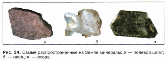 Минералы различают по таким признакам, как цвет, твердость, блеск, прозрачность, плотность. Минералы образовывались и продолжают образовываться как в глубоких слоях земной коры, так и на ее поверхности. Людям известно около 3000 минералов. Большинство из них встречается редко. К редким минералам относятся алмаз, платина, серебро, графит. Широко распространенных минералов, из которых в основном состоят горные породы, всего несколько десятков. Больше всего на Земле полевых шпатов, кварца, слюд (рис. 34). Минералы образуют горные породы.