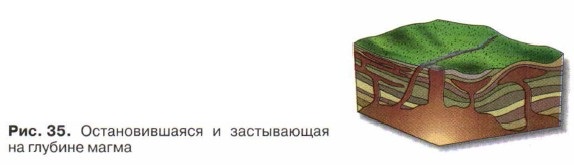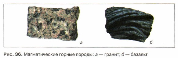 Магма образуется на глубине от 10 до 200 км от поверхности Земли. Она имеет очень высокую температуру — более 1500 С. Образовавшаяся магма поднимается в вышележащие слои горных пород. Она может остановиться на глубине нескольких километров (рис. 35). Из медленно остывающей на глубине магмы постепенно образуются глубинные магматические породы. Самая распространенная из них — гранит (рис. 36, а).