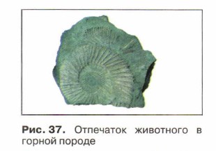 Излившись на поверхность суши или дно океанов, лава очень быстро застывает. Из нее образуются излившиеся (вулканические) магматические горные породы, например базальты (рис. 36, б). Осадочные горные породыОсадочные горные породы образуются путем осаждения и накопления минералов на поверхности земной коры. Благодаря этому они часто имеют слоистое строение. Многие осадочные породы возникают при участии живых организмов. Поэтому в осадочных породах часто встречаются остатки и отпечатки растений и животных (рис. 37). Происхождение осадочных пород может быть различным.