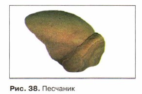 По отпечаткам узнают об особенностях строения древних вымерших организмов. В результате разрушения и выветривания горных пород образуются обломочные и глинистые породы. Обломочные состоят из обломков пород и минералов. Крупные, метровые обломки образуют глыбы и валуны, сантиметровые — щебень, гальку, гравий, миллиметровые частицы — песок. Обломки разного размера могут соединяться, «склеиваться» между собой. Породы в этом случае становятся монолитными и твердыми. Так из песка образуется песчаник (рис. 38).